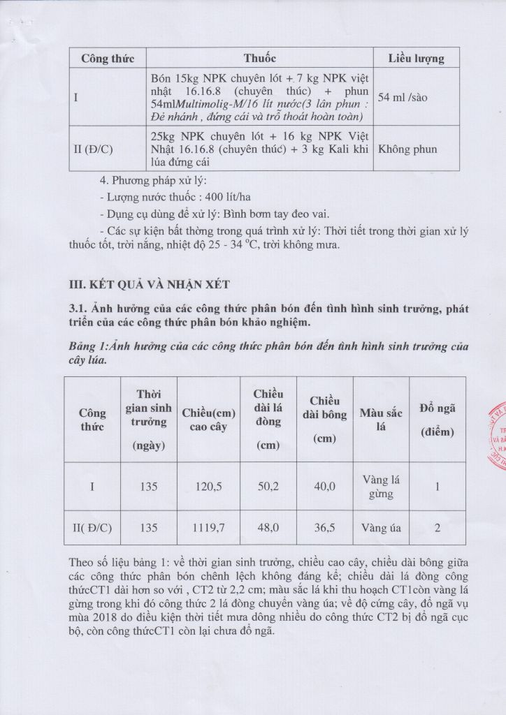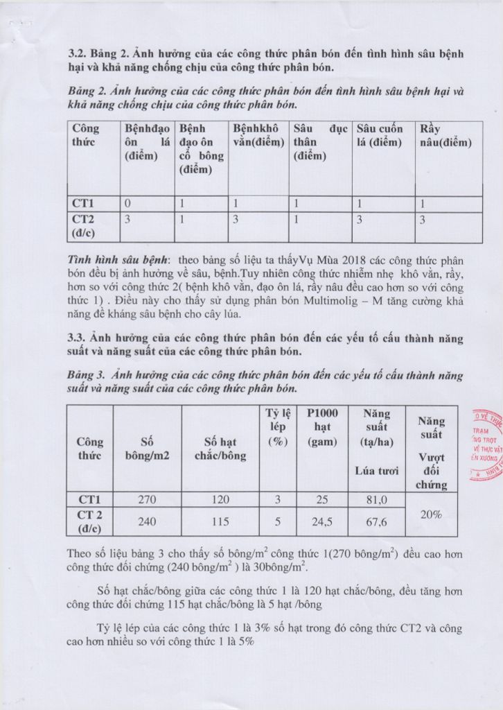 Báo cáo kết quả khảo nghiệm trên giống lúa BC15 tại huyện Kiến Xương - Thái Bình cho thấy lúa BC15 sinh trưởng và phát triển tốt, nhiễm nhẹ sâu bệnh, năng suất hạt lúa vượt trội so với công thức đối chứng là 16%, và một điều quan trọng hơn là Multimolig-M không gây ngộ độc cho cây lúa.
