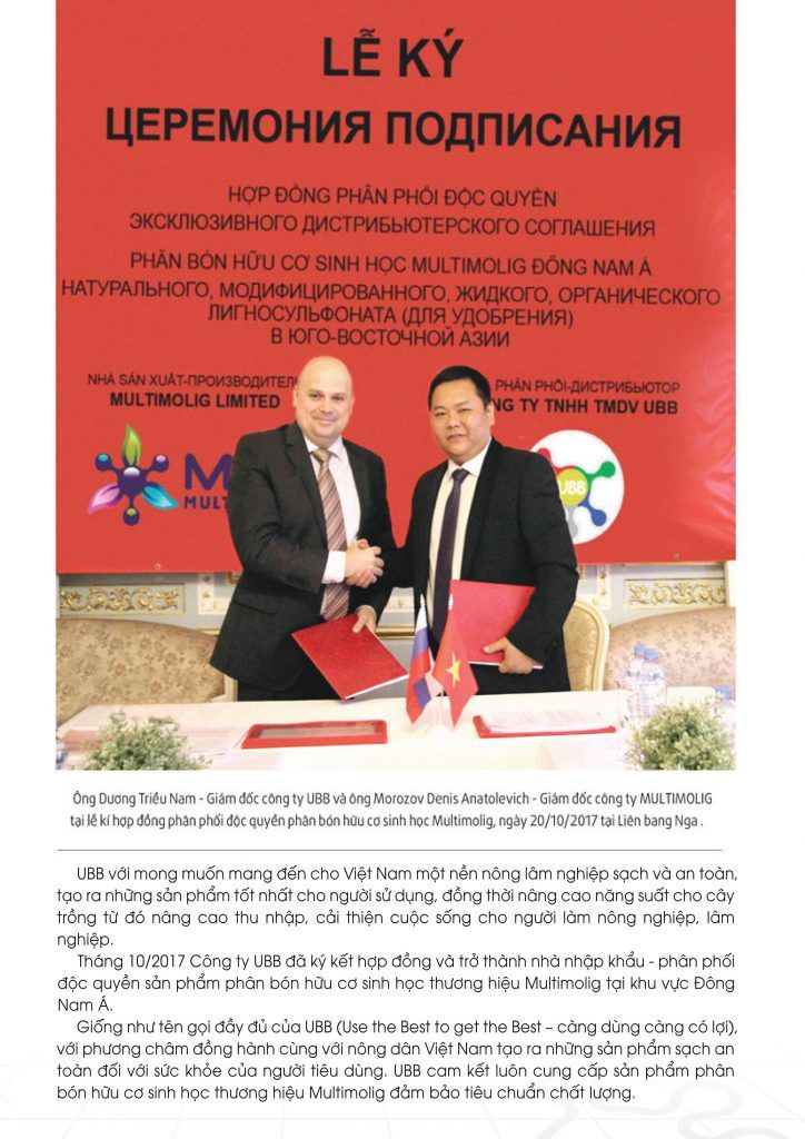 Công ty TNHH Thương mại dịch vụ UBB là doanh nghiệp độc quyền nhập khẩu sản phẩm Phân bón lá Hữu cơ sinh học Multimolig-M tại khu vực Đông Nam Á và Trung Quốc. Tháng 10 năm 2018, Công ty cổ phần thương mại dịch vụ MNV ký hợp tác với Công ty UBB, chính thức trở thành Nhà phân phối độc quyền kinh doanh sản phẩm Phân bón lá Hữu cơ sinh học Multimolig-M tại thị trường Việt Nam.